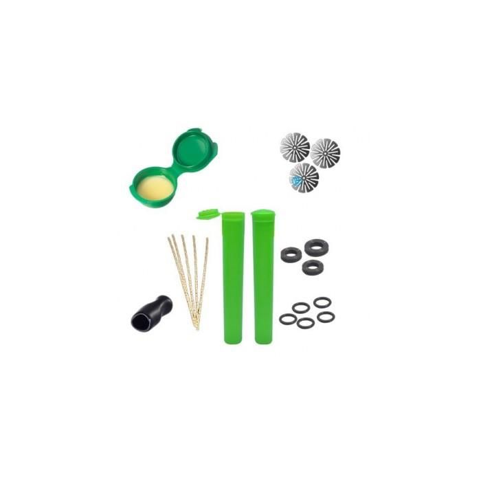 The DynaVap DynaKit Basic is a kit designed for maintaining your DynaVap vaporizer. This kit includes everything you need to keep your DynaVap in top condition, such as spare rubber parts, replacement screens, and pipe cleaners. Additionally, the kit includes DynaWax, which can be used to keep your rubber parts smooth and in good condition. The pipe cleaners are used for thorough cleaning of narrow parts. With the extra mouthpiece, you can use your DynaVap VapCap with a water pipe.