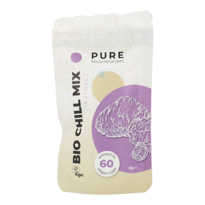 Pure Mushrooms Chill Mix Bio is a dietary supplement consisting of the popular mushrooms Reishi and Lion's Mane. It's a unique blend for daily use. Each capsule contains 180 mg of Reishi extract and 180 mg of Lion's Mane extract, supplemented with acerola extract for an extra boost of vitamin C. Chill Mix is suitable for vegetarians and vegans.