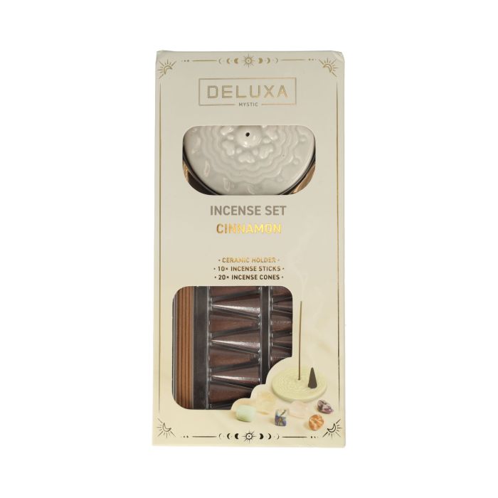 Le set d'encens Home Scents Deluxa Cannelle offre une expérience olfactive chaude et épicée dans un ensemble complet et élégant. Ce pack contient 10 bâtonnets d'encens, 20 cônes d'encens et un porte-encens céramique rond. L'odeur de la cannelle crée instantanément une atmosphère chaleureuse et accueillante à la maison - parfait pour les soirées automnales ou les moments douillets.