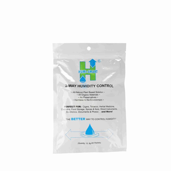 Le Contrôle d'Humidité à 2 Voies Humi-Smart est un outil idéal pour maintenir la bonne humidité de tout, des herbes aux cigares, en passant par le tabac, dans un récipient. Les paquets Humi-Smart sont disponibles dans différentes plages d'humidité. Le pourcentage d'humidité que vous souhaitez utiliser dépend évidemment de ce que vous souhaitez conserver, du contenant que vous allez utiliser et de la durée de conservation. Un paquet Humi-Smart avec un taux d'humidité de 72 % est idéal pour préparer une cave à cigares en bois. Le bois de la cave absorbera une partie de l'humidité pendant la préparation d'une nouvelle cave à cigares en bois (ou d'une cave à cigares qui n'a pas été utilisée depuis longtemps). Les caves à cigares déjà prêtes à l'emploi se contentent généralement d'un paquet d'humidité avec un pourcentage d'environ 65 %, bien que cela dépende bien sûr de ce que vous souhaitez conserver, de la quantité que vous allez stocker et de la durée de stockage. Un paquet Humi-Smart dure en moyenne environ 2 mois avant de devoir être remplacé. Lorsque le paquet Humi-Smart devient dur, toute l'humidité du paquet d'humidité s'est évaporée et il est temps de le remplacer par un nouveau.