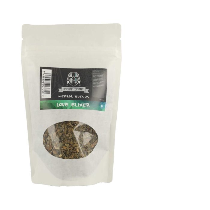 De mélange d'herbes Indian Spirit Love Elixer est un mélange d'herbes composé de Damiana, de feuilles de menthe poivrée, de zeste d'agrumes, de feuilles de Canavalia et de feuilles de papaye. Ce mélange d'herbes est utilisé pour préparer du thé.