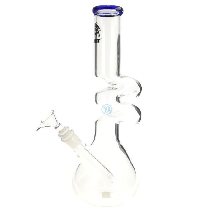 Wat deze bong bijzonder maakt, is de combinatie van de vertrouwde erlenmeyer vorm van het bekerdeel en de opvallende zigzagvorm in de hals. Dit geeft de bong een onderscheidende uitstraling die je niet snel ergens anders zult vinden. Boven aan de hals vind je een handige verdikking die meteen dient als mondstuk, en dit deel is gemaakt van prachtig blauw glas.