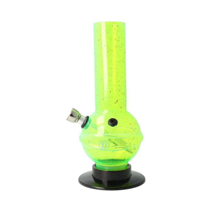 Stel je voor, een doorzichtige fluorescerend groene acrylbong die oplicht als een stralende ster in de nacht, versierd met levendige verfspetters die willekeurig lijken te dansen. Deze bong is als een kunstwerk op zich, terwijl je geniet van je favoriete wiet.